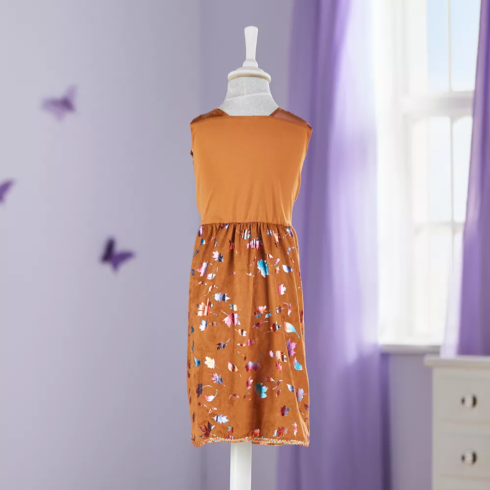 Au détour de la rivière, un monde d’aventures et de découvertes attend votre enfant. Ce déguisement Pocahontas en textile doux est garni d’un imprimé doré peignant les mille couleurs de l’air du vent.
