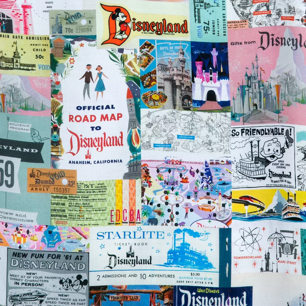 - Motif de visuels Disneyland vintage incluant des tickets d’entrée, des publicités, des cartes, des autocollants, des cahiers de coloriage et plus encore